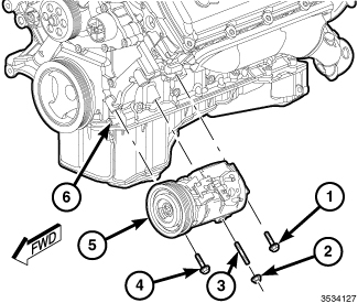 2. Position the A/C compressor to the engine (6) and install the stud (3). Tighten the stud to 10 Nm (89 in. lbs.).
