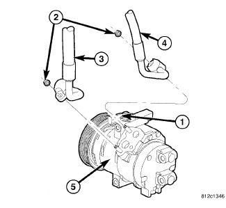 9. Connect the A/C suction and discharge lines onto the A/C compressor (5).