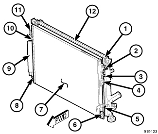 3. Install the four bolts (2, 5, 8 and 11) that secure the A/C condenser to the radiator. Tighten the bolts to 5 Nm (44 in. lbs.).