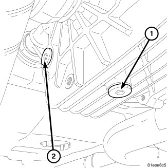 4. Remove rear axle fill plug (2). Fill axle with 1.2L (1.2 qts.) of Mopar(R) 75W-90 Synthetic Gear AND Axle Lubricant and one 4 oz. bottle of MOPAR(R) Limited Slip Additive Friction Modifier. Install fill plug and torque to 35 Nm (25 ft. lbs.).