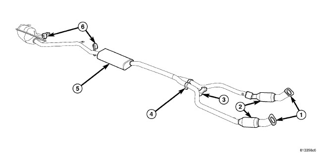 The 5.7L close coupled, three-way catalytic converter inlets are connected to the exhaust manifolds by the use of ball flange (1). The left and right side converter outlet pipe connects to the exhaust system. The 5.7L is bolted to the exhaust header. The 3.6L bolts directly to the integrated exhaust manifold . Exhaust Manifold - Description