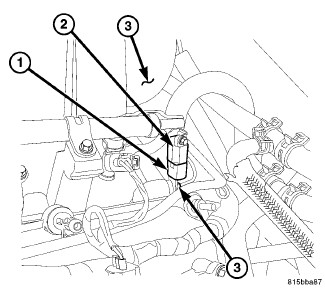1. Position the ignition capacitor (2) at the left rear corner of intake manifold (3).