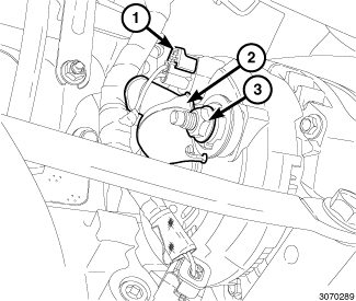 9. Tighten the generator support bracket (3) to engine mount retaining nut (1) to 28 Nm (21 ft. lbs.).