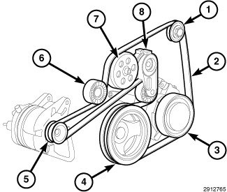 14. Rotate the accessory drive belt tensioner (8) clockwise until it contacts the stop, install the accessory drive belt (2) onto the pulleys and slowly release the tensioner.