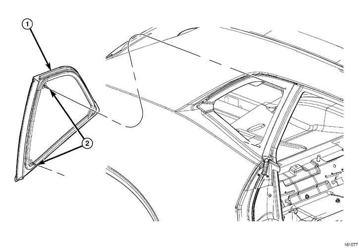 2. Place the quarter glass (1) into the window opening and insert mounting studs (2) through the holes in the window fence.