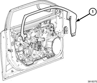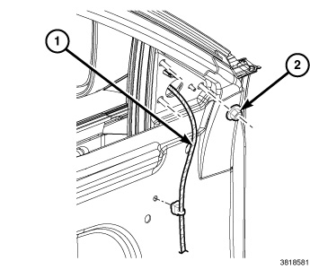 1. Feed the mirror wire harness (1) through the access hole in the mirror flag.