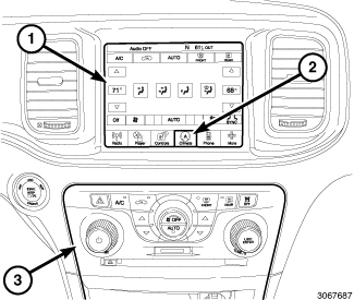 The controls for both of the Dual Zone heating and A/C systems are located in the U-Connect Touch (TM) screen module (1), under the Climate tab (2), and on the switchbank (3) at the center of the instrument panel.