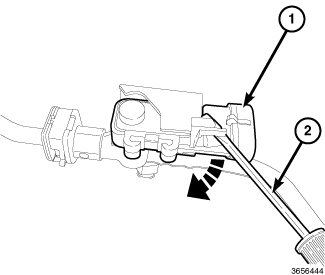 8. Carefully raise the retaining tab (2), rotate and remove the fuel tank pressure sensor (1) from the fuel tank vent tube.