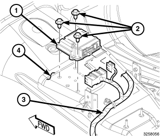 1. Carefully position the Occupant Restraint Controller (ORC) (1) onto the floor panel transmission tunnel (4). When the ORC is correctly positioned, the orientation arrow on the ORC label will be pointed forward in the vehicle.