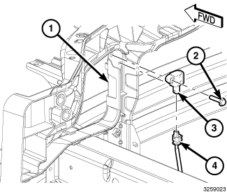 1. Position the right or left front impact sensor (3) to the back of the Front End Module (FEM) vertical support member (1) between the cooling module and the front lamp unit opening.