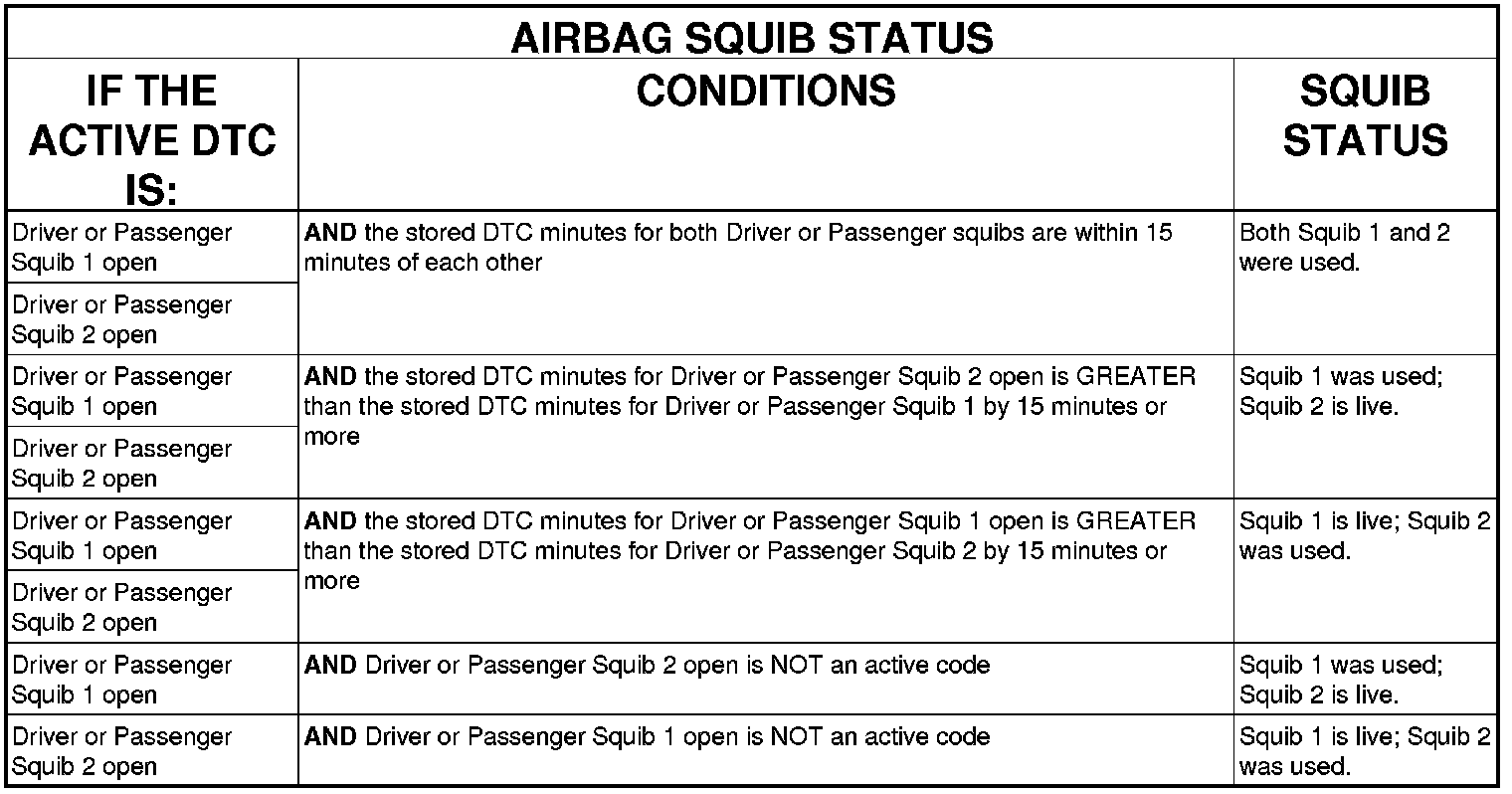 Using the active DTC information, refer to the Airbag Squib Status table to determine the status of both driver and passenger airbag squibs.
