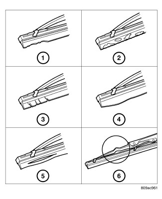 4. After cleaning and inspecting the wiper components and the glass, if the wiper blade still fails to clear the glass without smearing, streaking, chattering, hazing or beading, replace the wiper blade.