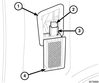 4. Using hand pressure, press the upper (notched) edge of the lamp lens (4) into the mounting hole until the movable retention tabs snap into place and the lens is just proud of the trim panel.