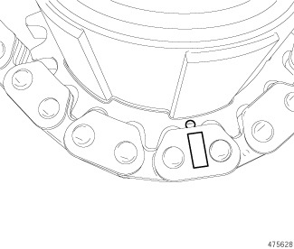 While holding the camshaft phaser in hand, position the timing chain on the camshaft phaser and align the timing marks as shown.