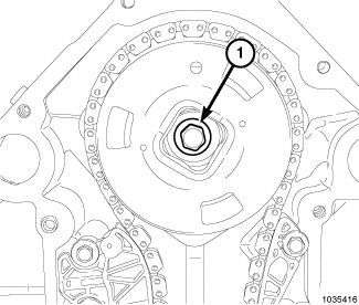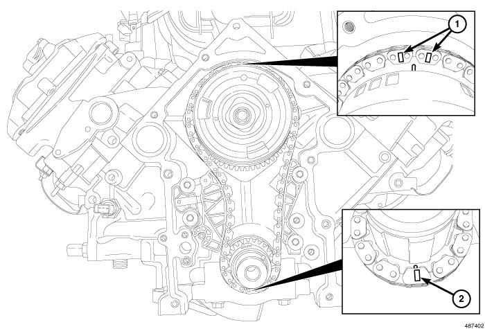 Rotate the crankshaft two revolutions and verify the alignment of the timing marks (1,2). If the timing marks do not line up, remove the camshaft sprocket and realign.