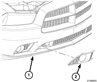 3. Unsnap and remove the plastic bezel (2) from the right lower air intake opening in the front fascia (1).