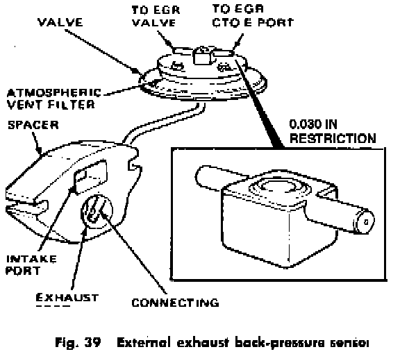 The EGR system, when equipped with an external back-pressure sensor, Fig. 39, obtains a vacuum signal at the carburetor spark port and not the EGR port. The vacuum signal passes through the EGR CTO (Coolant Temperature Override) switch (when coolant temperature exceeds 115° or 160° F) to the valve portion of the sensor where it is modulated by exhaust back-pressure.