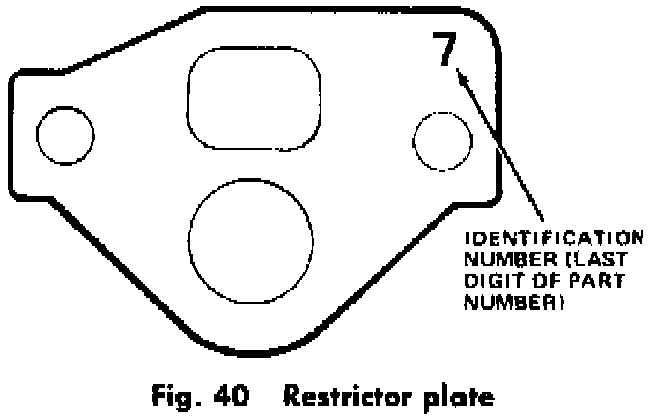 All six cylinder and some V8-304, 360 engines incorporate a steel restrictor plate, Fig. 40, under the exhaust back-pressure sensor. The restrictor plate limits the rate of EGR flow, thereby improving driveability.