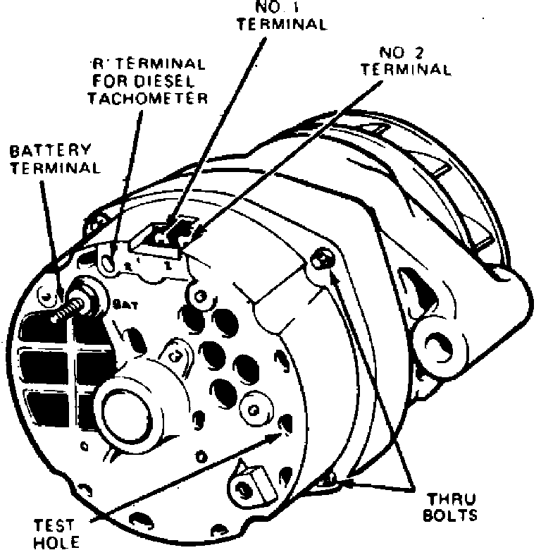 Some alternators used on diesel engines are equipped with an R terminal for the tachometer. On these units, if the alternator pulley is to be replaced, a pulley of the same diameter as the one removed must be installed, otherwise tachometer may provide inaccurate readings.