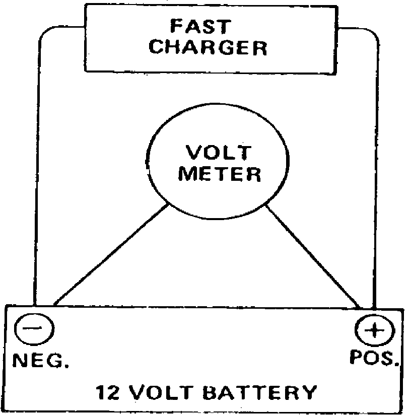 1. Connect voltmeter and fast charger to 12 volt battery as shown.