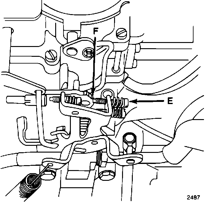 4. Position the fast idle speed adjustment screw (E) in contact with and against the shoulder of the second step (F) of the fast idle cam.