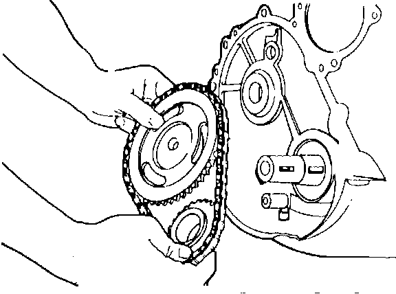 1. Install crankshaft sprocket, camshaft sprocket and timing chain as an assembly. Ensure crankshaft and camshaft sprocket timing marks are aligned.