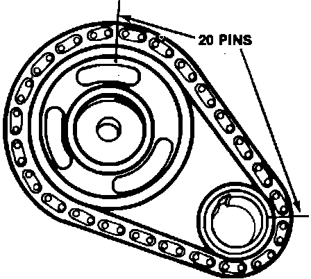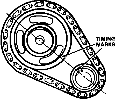 2. Install camshaft sprocket retaining bolt and washer. Torque camshaft sprocket retaining bolt to 50 ft. lbs. To verify correct installation of timing chain, rotate crankshaft to position camshaft sprocket timing mark at one o'clock. The crankshaft sprocket timing mark should now be at the three o'clock position. There should be 20 timing chain pins between the timing marks of both sprockets.