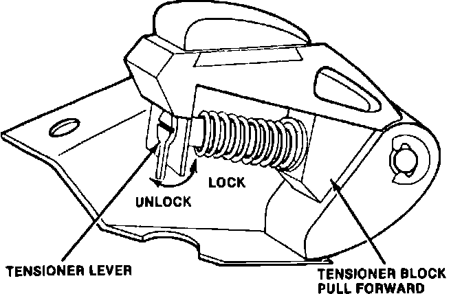 b. Pull tensioner block toward tensioner lever. Hold tensioner block and turn tensioner lever to lock (up) position.