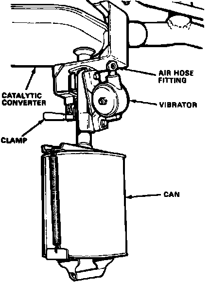 8. Install refill can on vibrator and connect air hose to vacuum pump attached to tailpipe. Pellets will be drawn into converter. If any pellets exit from the tailpipe, the converter housing is defective and must be replaced.