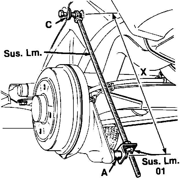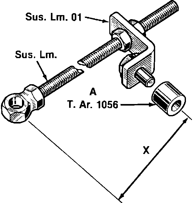 d. Install, then adjust threaded rod tool Sus.Lm (A) with tool Sus.Lm.01 bracket until dimension X is 19.37 inches on sedan models or 18.97 inches on wagon models.