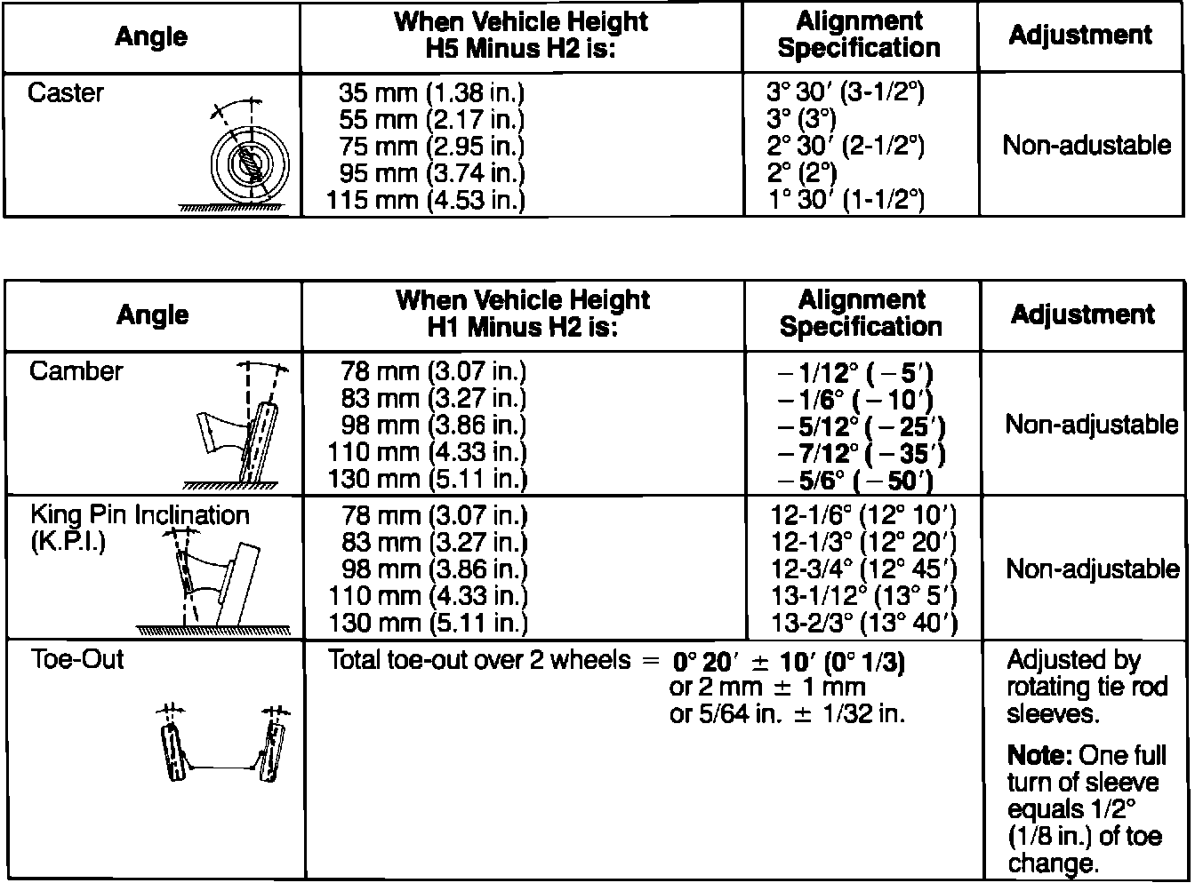 Note: Vehicle weight must be on all four tires before tightening suspension bushing bolts on such components as the control arms and stabilizer bars. In addition, vehicle height must be determined before checking front end alignment. Refer to the height measurement information on pages J-5 and J-6 of this manual. Record the vehicle heights measured and locate the height value closest to the actual alignment specification. The specifications shown for camber and K.P.I. are +/- 1/2~ side-to-side variation must not exceed 1~ for caster, camber or K.P.I.