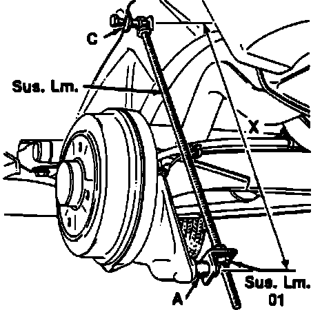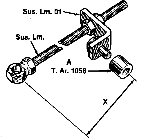 d. Install, then adjust threaded rod tool Sus.Lm (A) with tool Sus.Lm.01 bracket until dimension X is 19.37 inches on sedan models or 18.97 inches on wagon models.