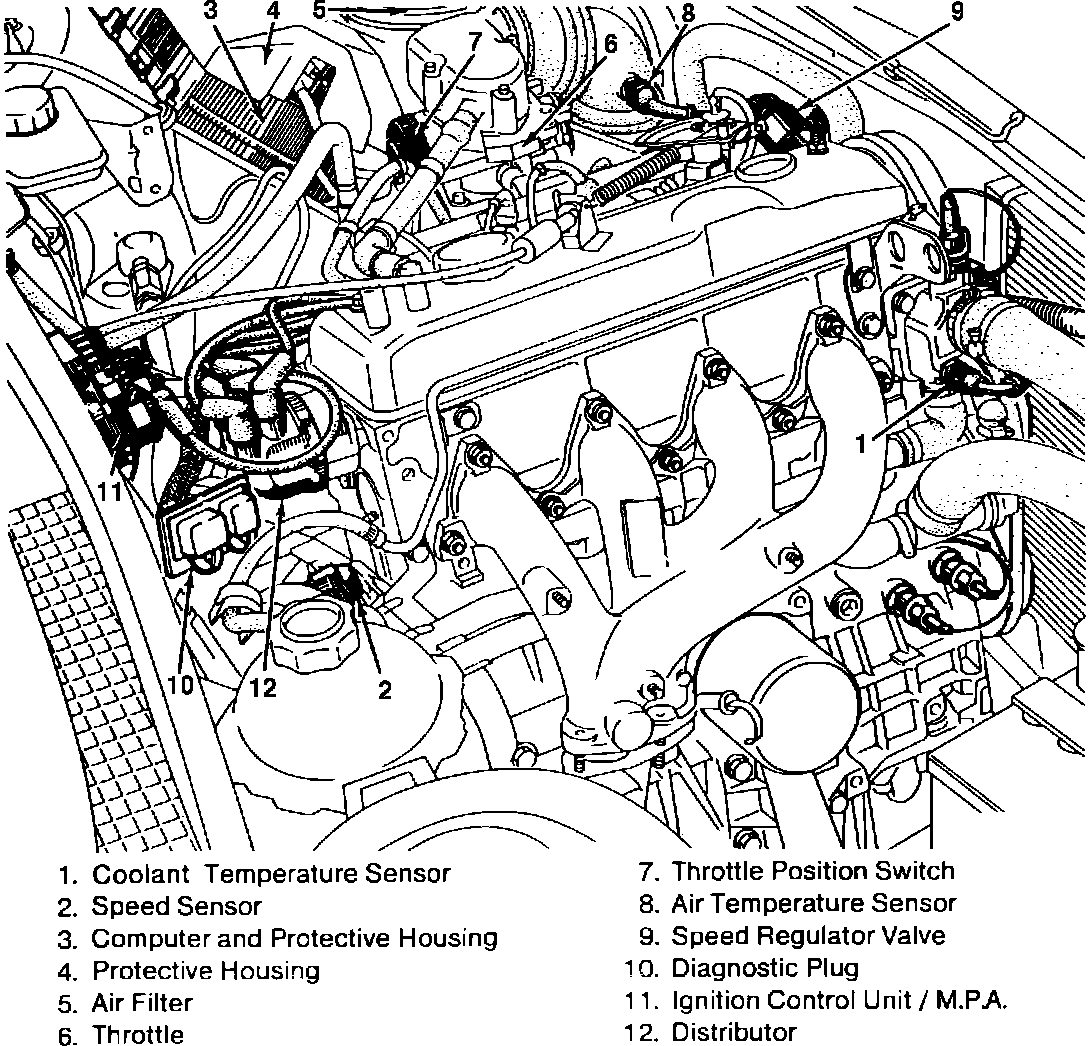Fig. 5 Engine compartment reference diagram. 4-132/2.2L Engine: