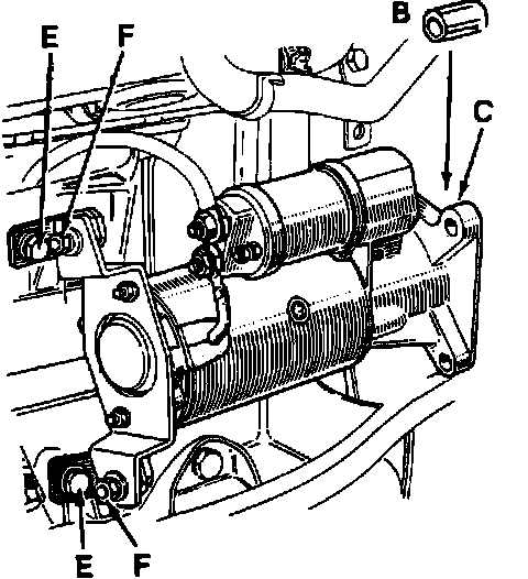 4. Remove starter motor rear mounting bolts (E).