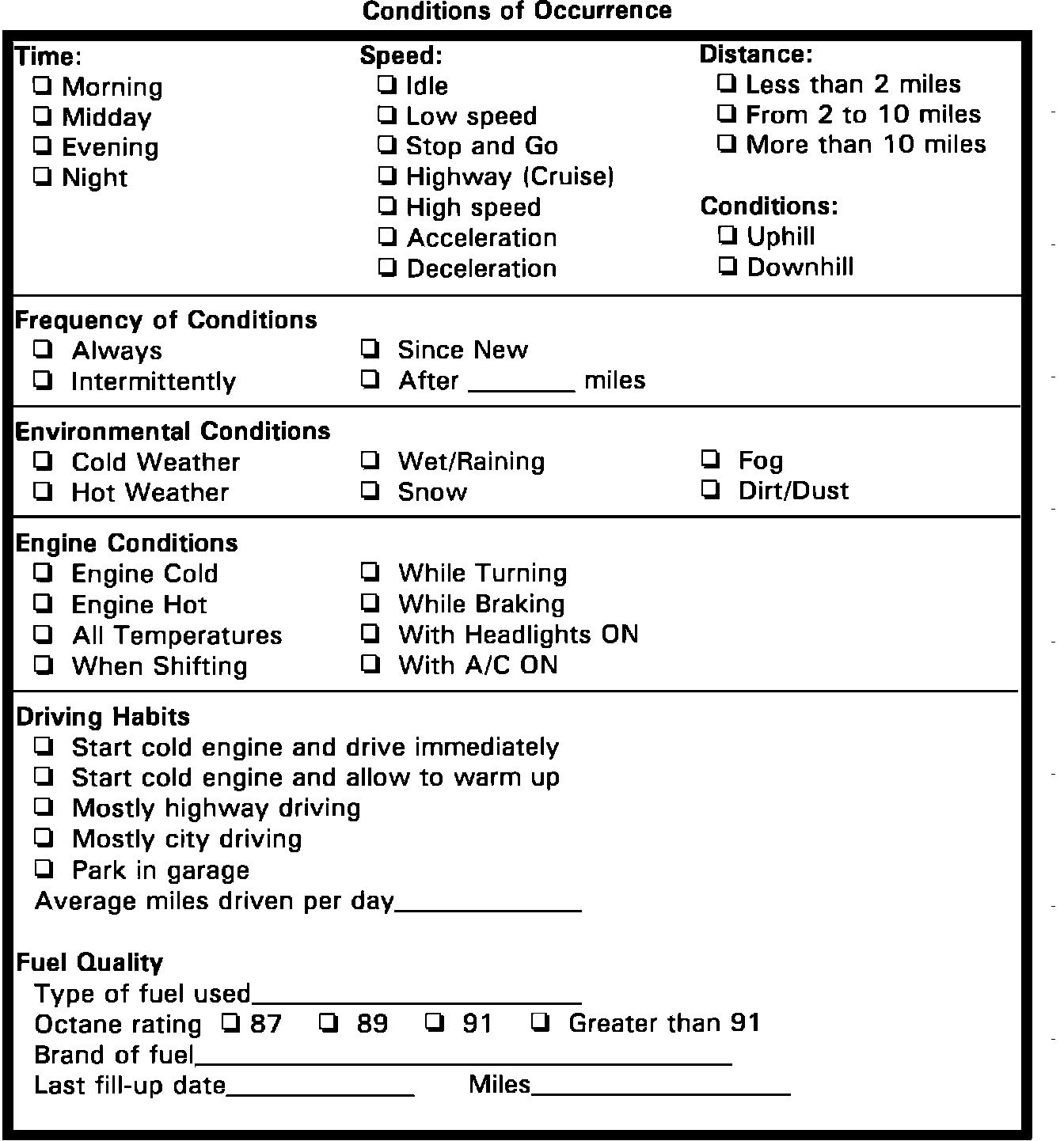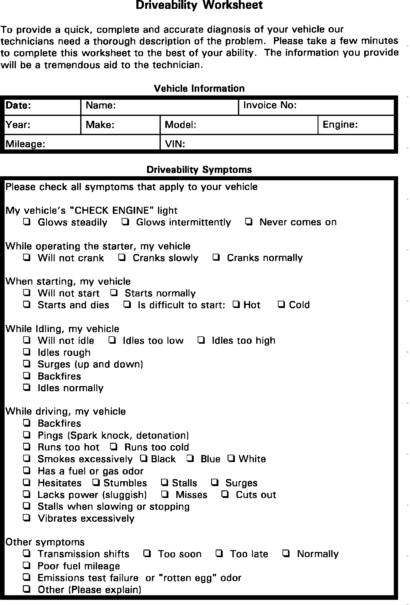 1. Verify customer complaint. It is important that you get an accurate description of the problem. What condition is the engine under when the problem occurs? Verify the complaint by road testing. For further description use DRIVEABILITY WORKSHEET and VEHICLE REPAIR HISTORY forms below.