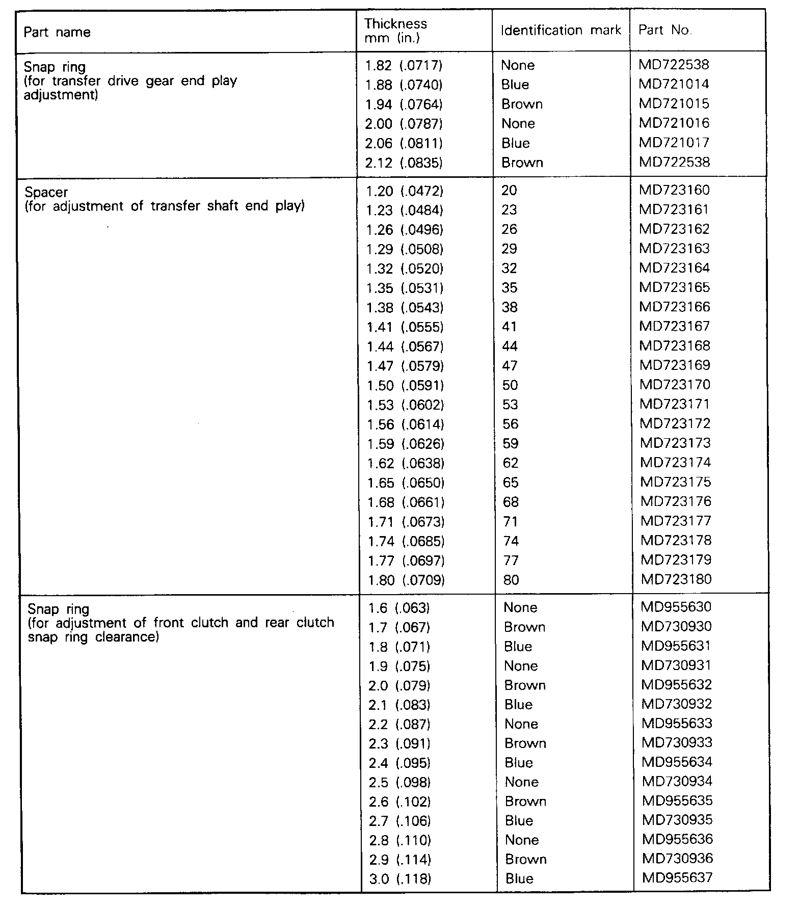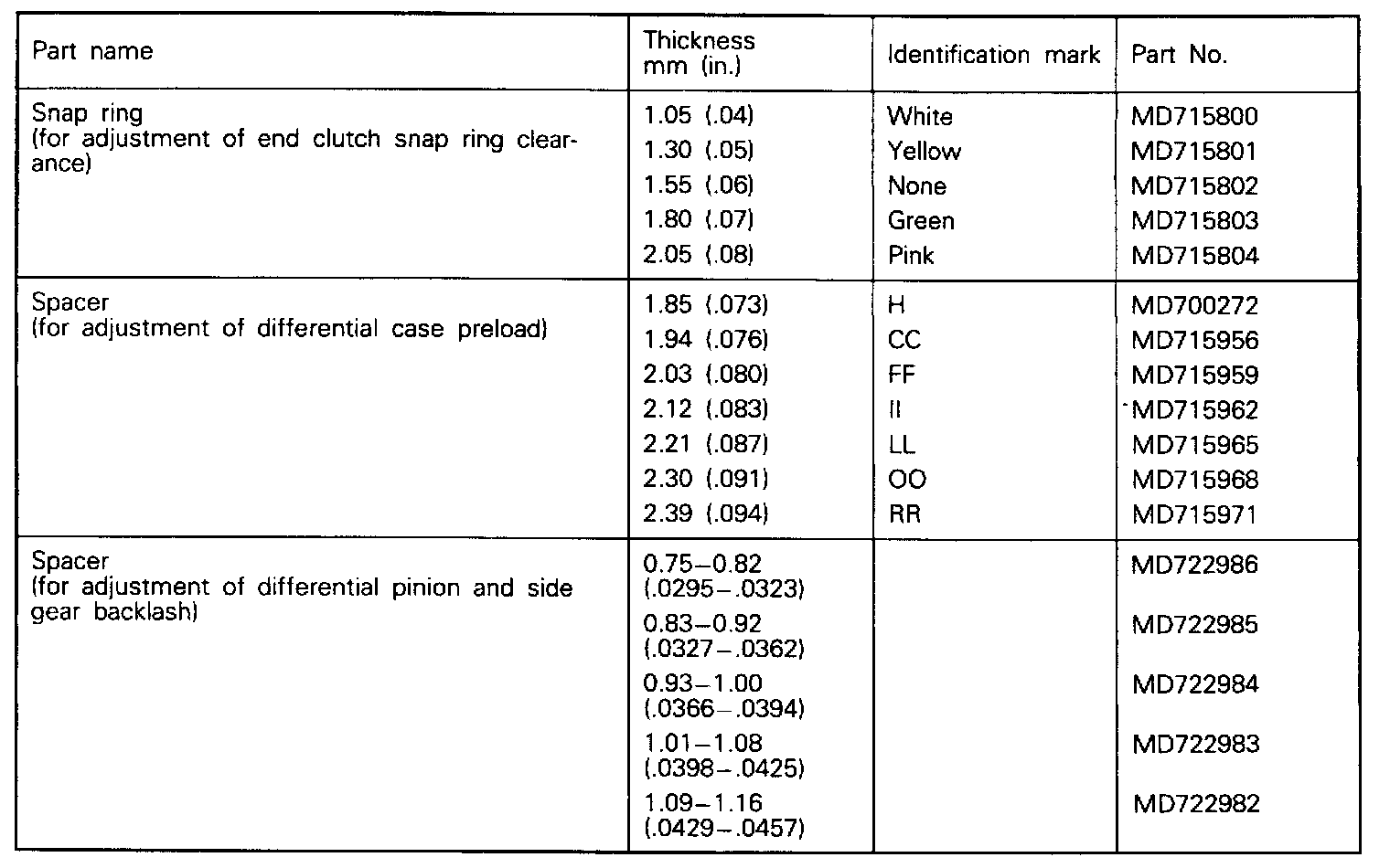 Spacer And Snap Ring Chart: