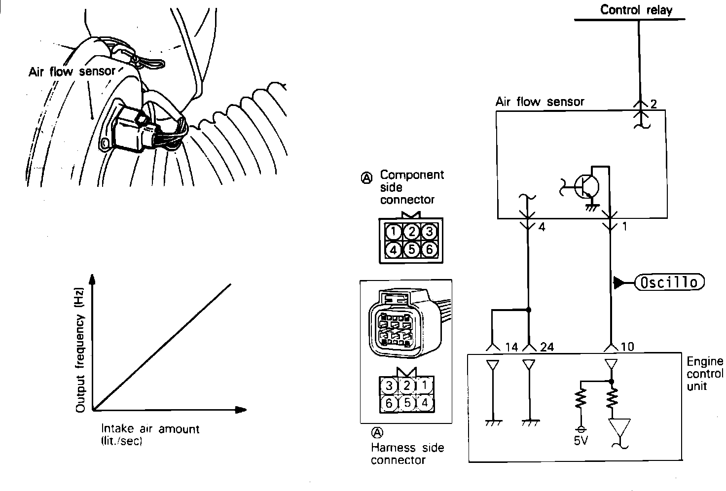 NOTE: If the Air Flow Sensor fails, the intake air volume cannot be measured and as a result, normal fuel injection control is no longer available. However, the vehicle will run using the pre-programmed value.
