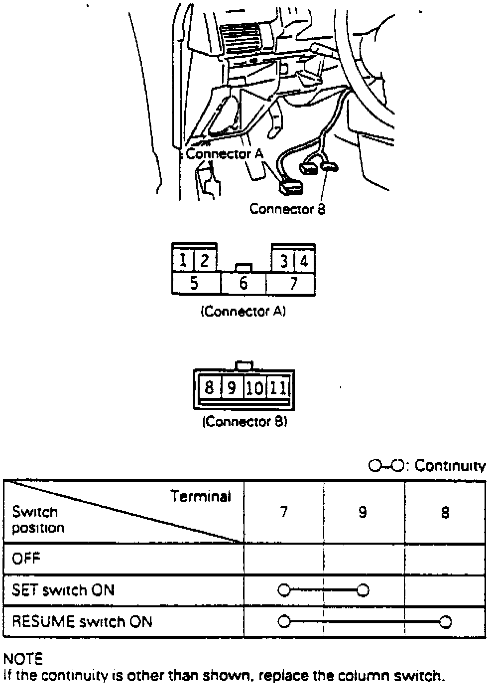 Gain access and disconnect connector to speed control main switch and check for continuity between terminals as shown.