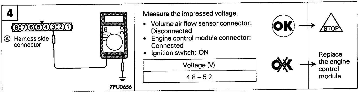 Hint 2: If the volume air flow sensor output frequency is other than 0 when the ignition switch is turned ON (but not starting the engine), faulty volume air flow sensor or engine control module is suspected.