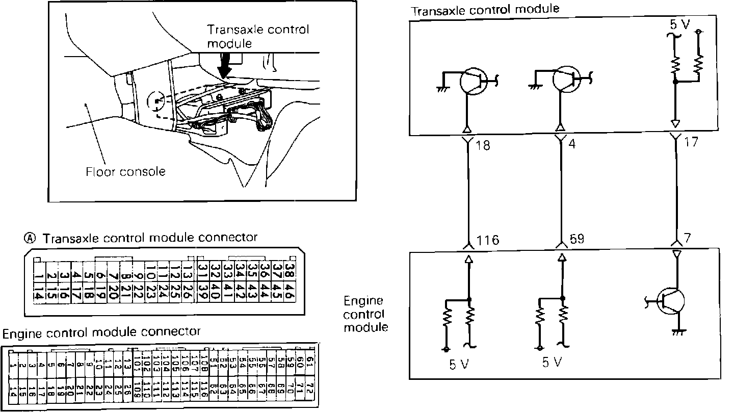 There are 3 communication lines providing torque reduction request and torque reduction execution (retared timing) signals. They connect the engine ECU with the transaxle control unit. Two of these lines send 5 Volts from the engine ECU to the transaxle control unit. The other provides 5 Volts from the transaxle control unit to the engine ECU.