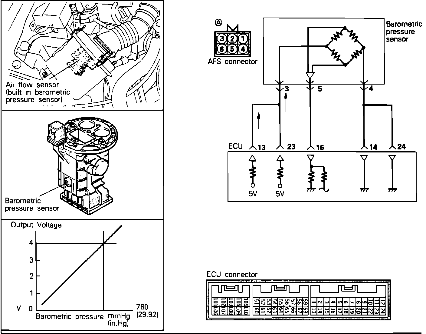 The ECU uses the voltage signal to adjust the air-fuel ratio and ignition timing for the altitude at which the vehicle is running, thus improving driveability at high altitude.