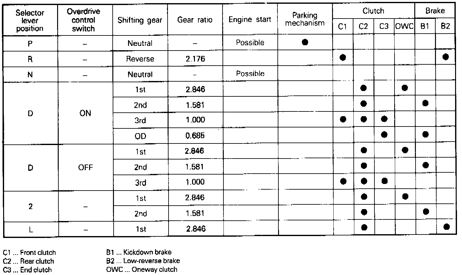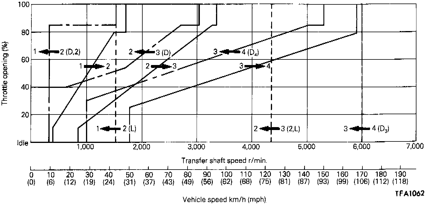 Two shift patterns are pre-stored in the control module of this transaxle. One is the power pattern (for more powerful performance), and the other is the economy pattern (for improved fuel consumption and quieter operation).