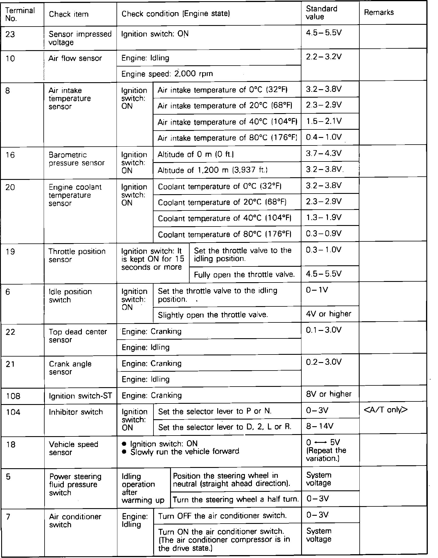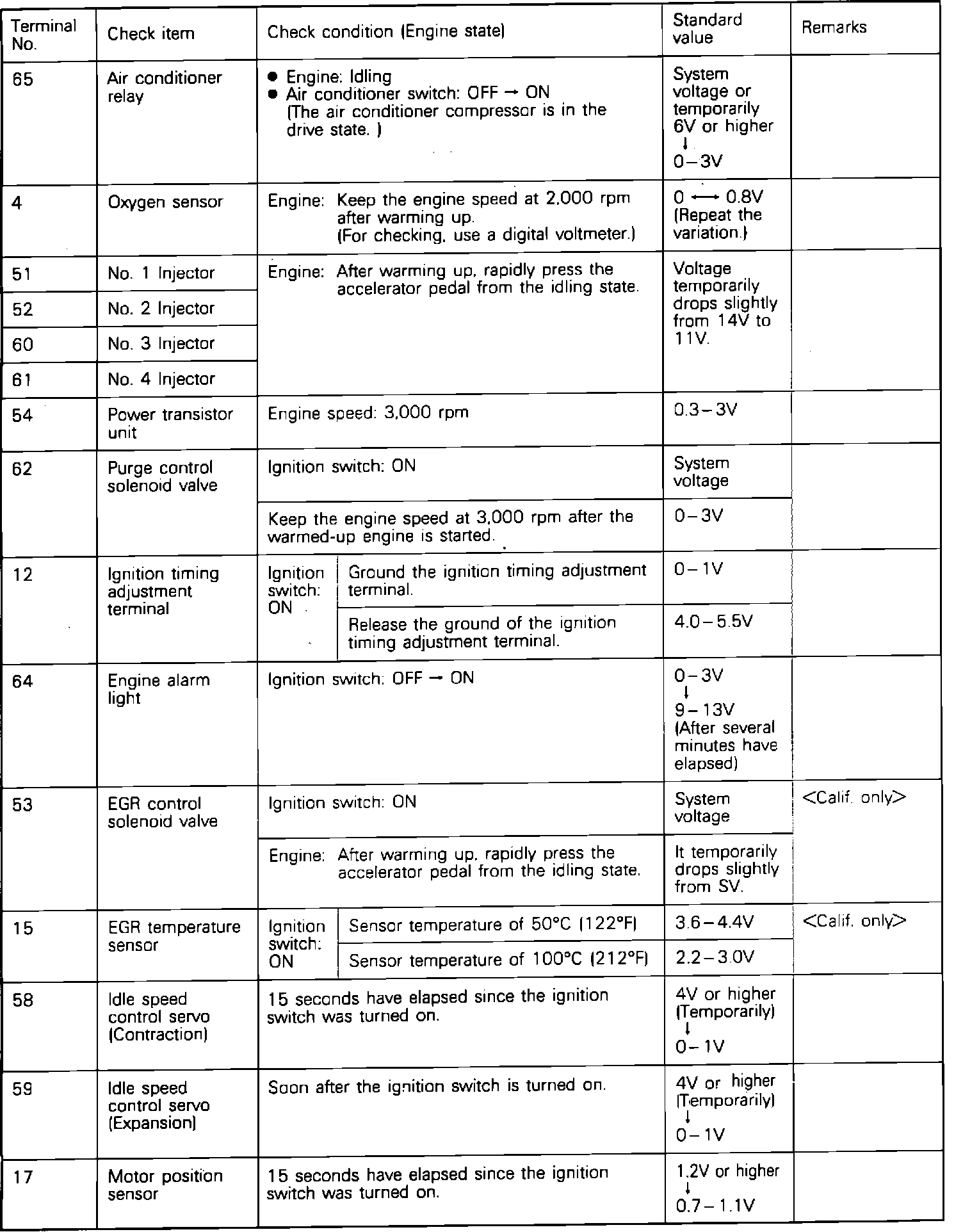 If voltage measured differs from that listed on the chart, check the corresponding sensor, actuator, or related electrical circuit. After repairs have been completed, recheck voltmeter readings to confirm that the repair has corrected the problem.