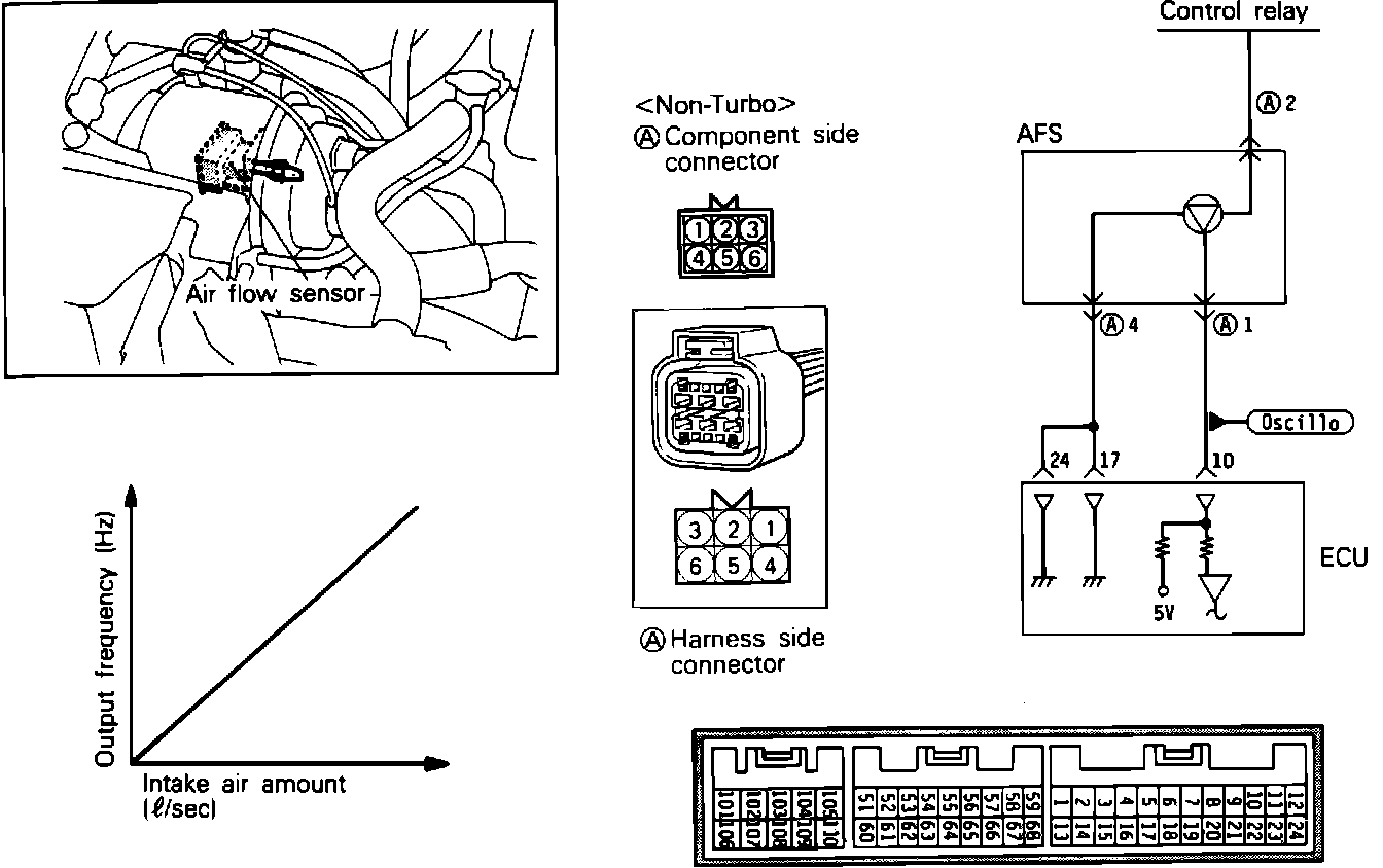 Note: If the air flow sensor fails, the intake air volume cannot be measured and as a result, normal fuel injection control is no longer available. However, the vehicle will run using the pre-programmed value.