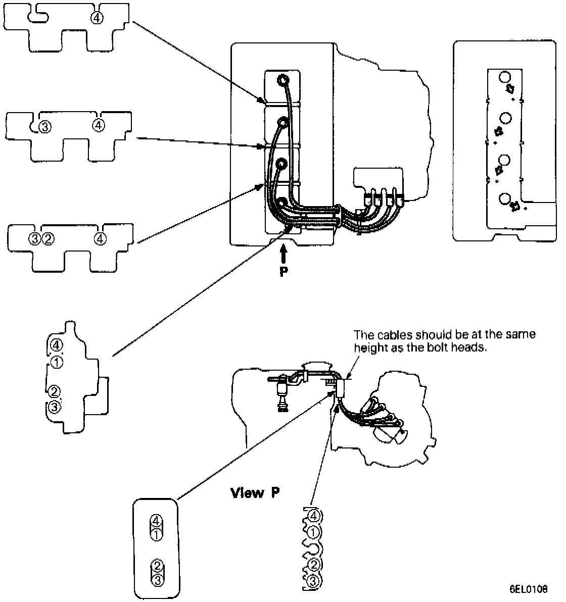 Note: Improper arrangement of spark plug cables will induce voltage between the cables, causing miss firing and developing a surge at acceleration in high-speed operation. Therefore, be careful to arrange the spark plug cables properly by the following procedure.