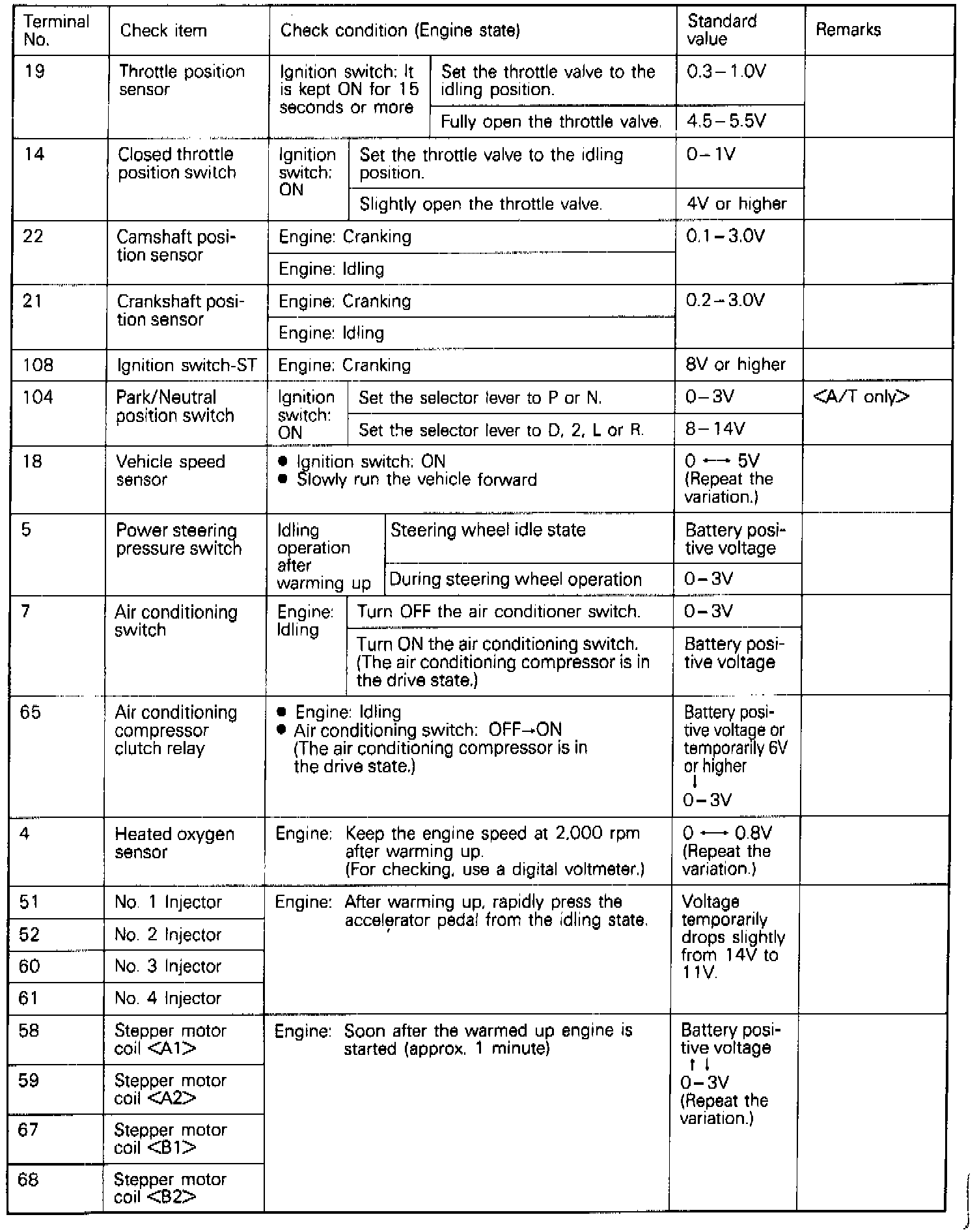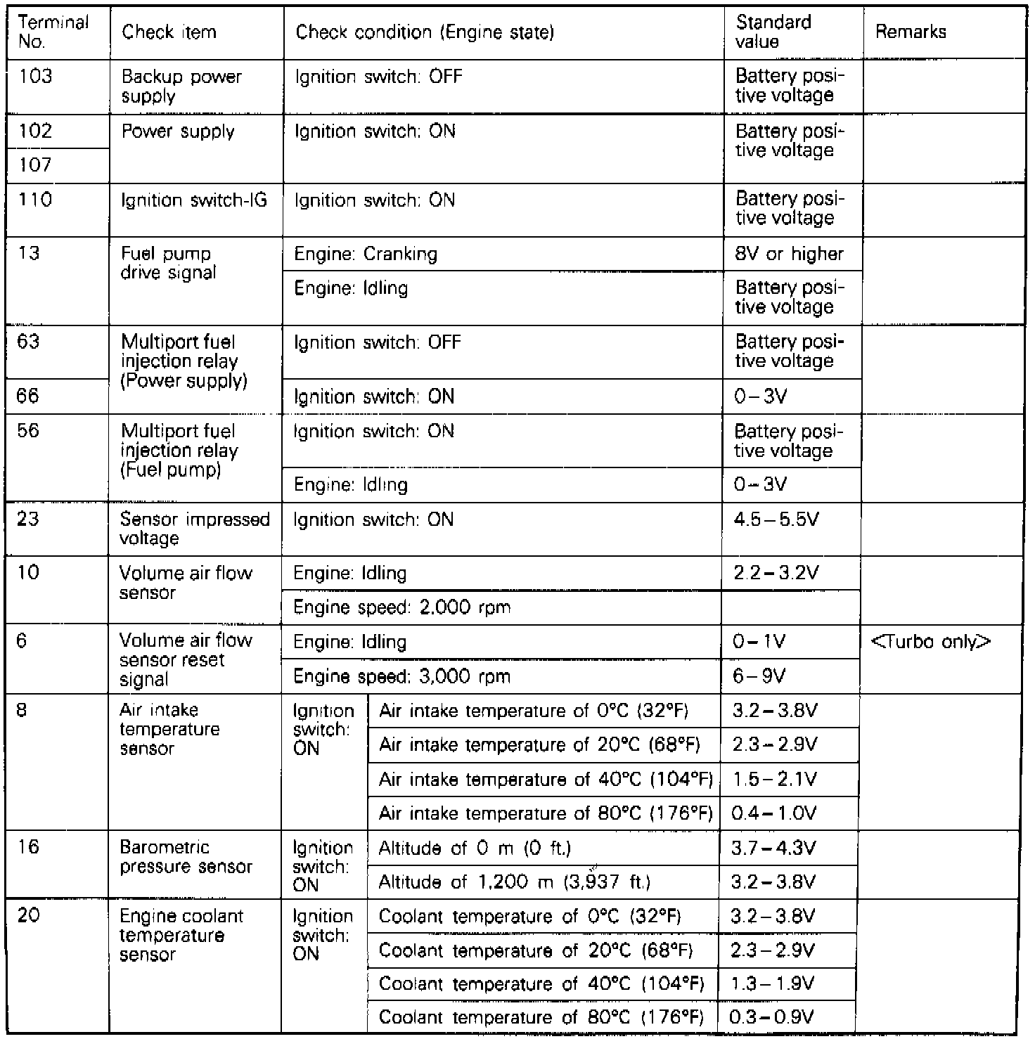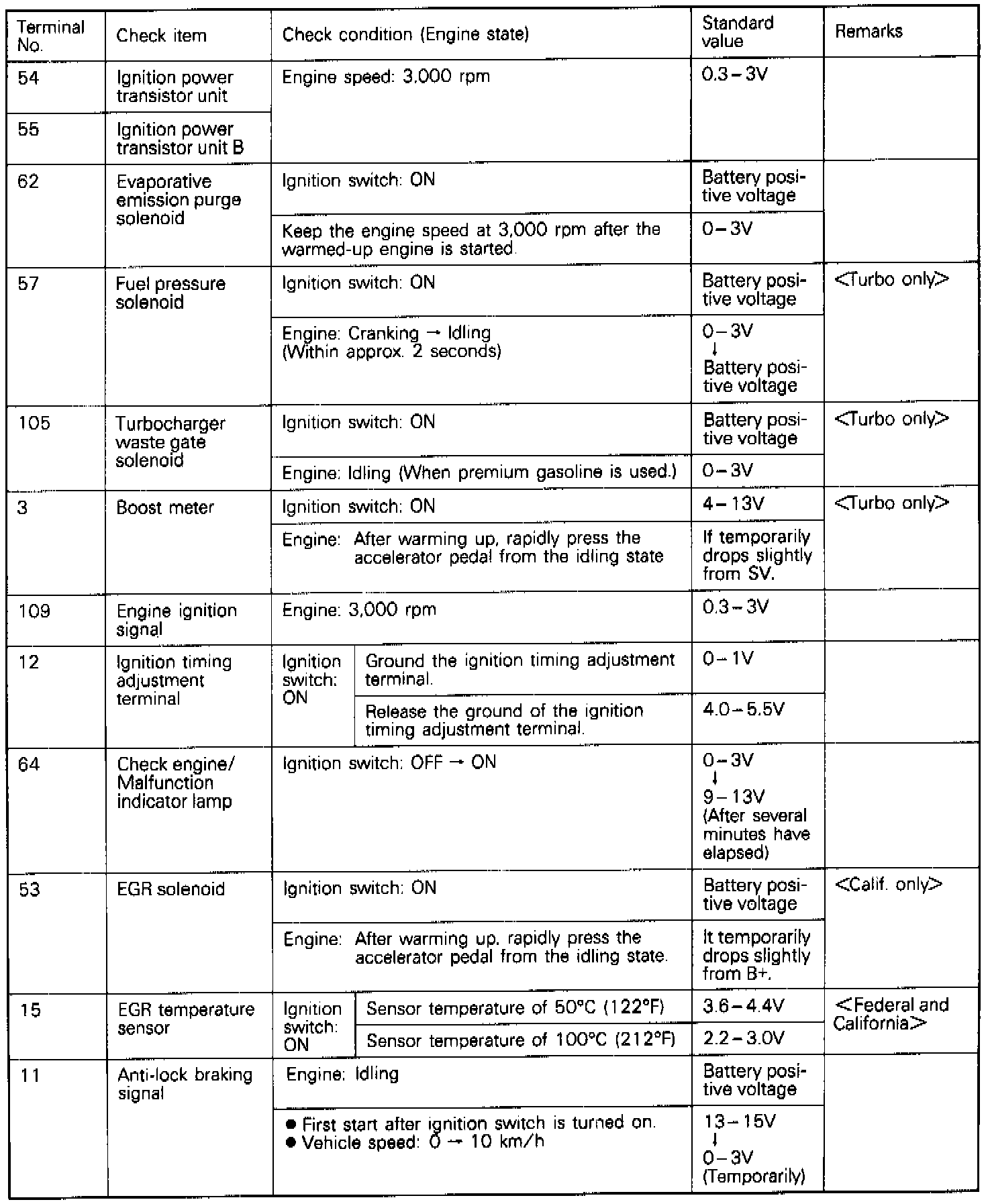 If voltage measured differs from that listed on the chart, check the corresponding sensor, actuator, or related electrical circuit. After repairs have been completed, recheck voltmeter readings to confirm that the repair has corrected the problem.