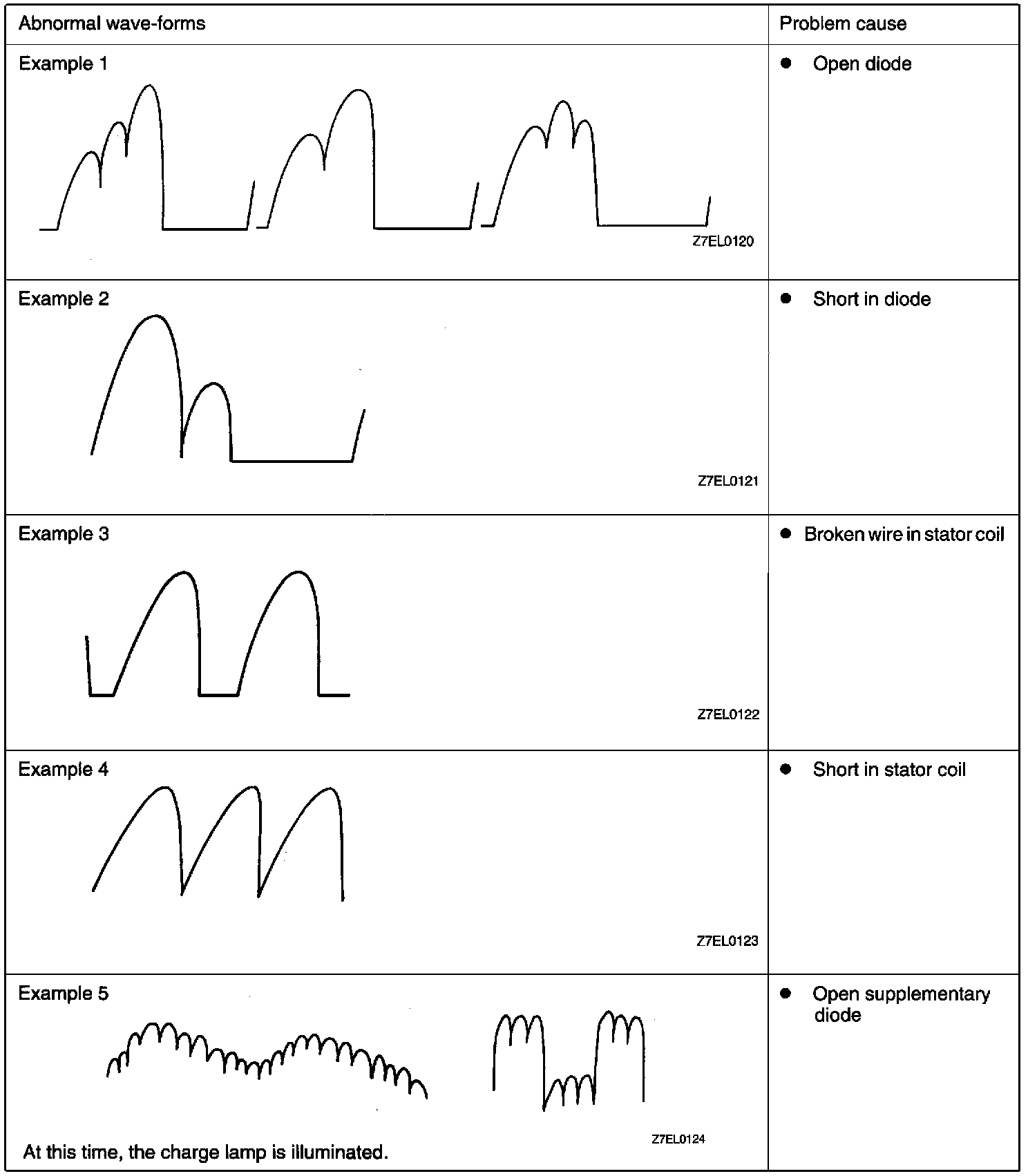2. Identification of abnormal waveforms is easier when there is a large output current (regulator is not operating). (Waveforms can be observed when the headlights are illuminated.)