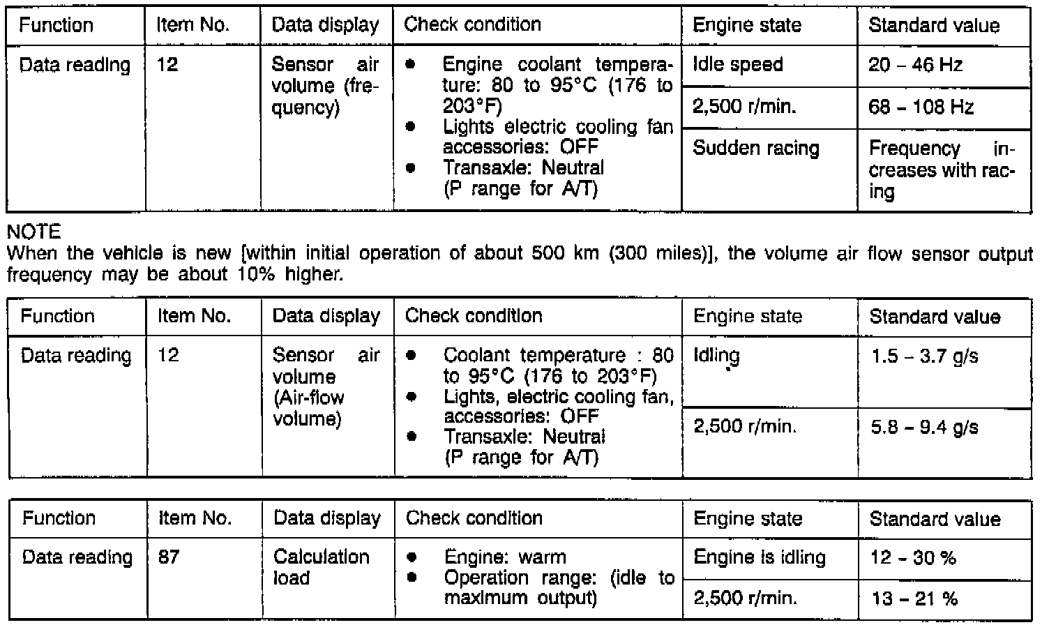 Hint 2: If the volume air flow sensor output frequency is other than 0 when the ignition switch is turned ON (but not starting the engine), faulty volume air flow sensor or engine control module is suspected.