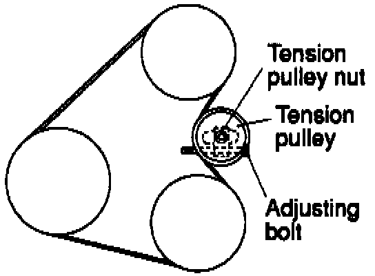 1. Using a suitable belt tension gauge, measure drive belt deflection by pulling or pushing at mid-point of the belt between pulleys shown with a force of 22 lbs.