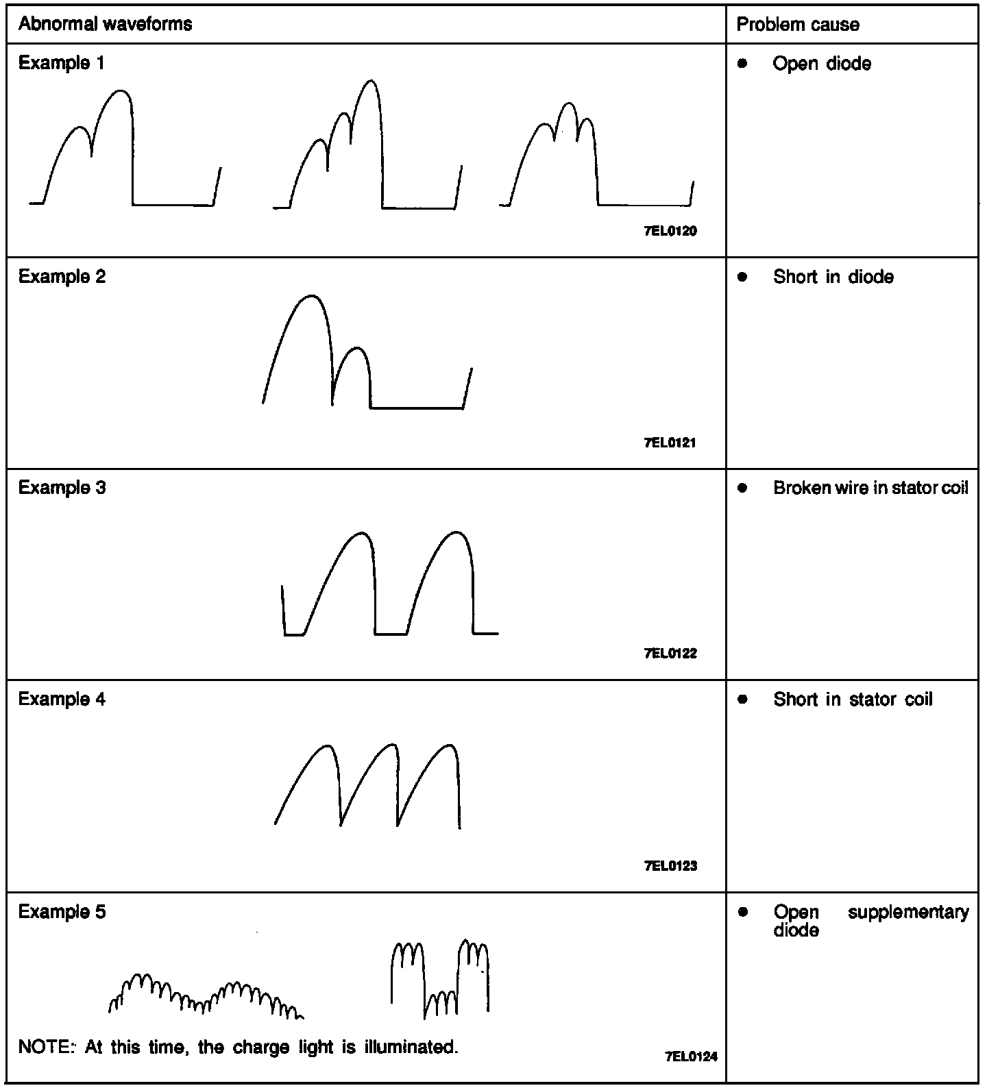 2. Identification of abnormal waveforms is easier when there is a large output current (regulator is not operating). (Waveforms can be observed when the headlights are illuminated.)